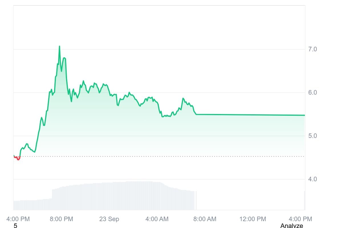 • Current price range: $5.20–$5.70, with strong trading volume signaling continued market interest.
