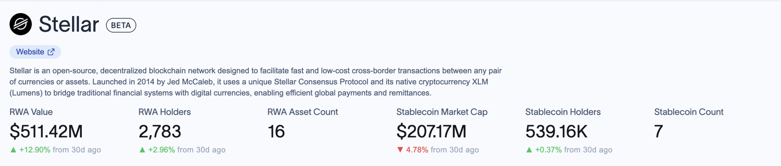 The biggest driver is its real-world asset (RWA) growth, which climbed 12.9% in the last 30 days to $511.42 million in value. That makes Stellar one of the few large-cap projects ending August on a positive fundamental note.