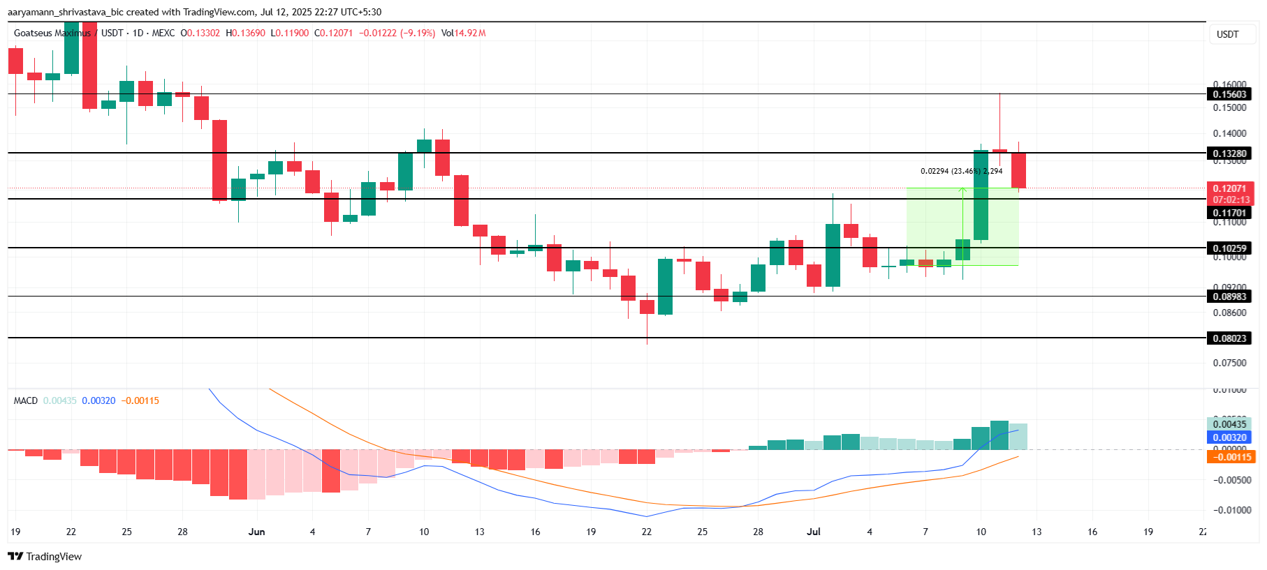 Currently trading at $0.120, GOAT is holding above the critical support level of $0.117. The MACD indicates that bullish momentum is strengthening, potentially pulling the price back up.