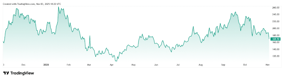 Solana remains one of the strongest Layer-1 networks in the market. It currently trades near $175, with a market cap of roughly $97 billion. The network’s speed, scalability, and developer community have positioned it as a core competitor to Ethereum.