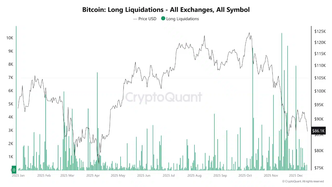 The sell-off was led by leverage snapping in the Futures market. As the chart shows, every sharp drop in Bitcoin’s price lines up with spikes in long liquidations across exchanges.