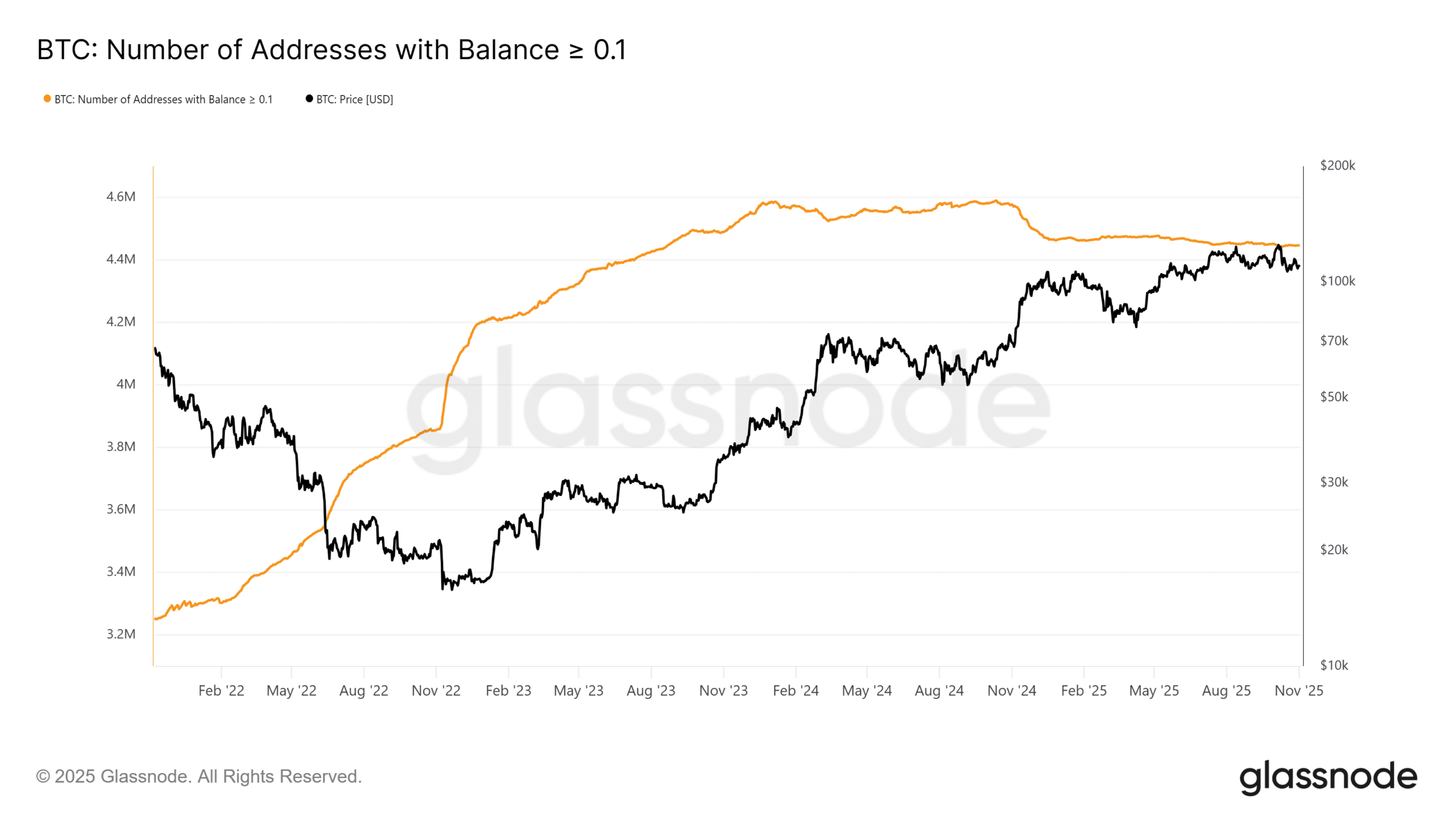 AMBCrypto’s review of Glassnode data confirmed the number of addresses holding at least 0.1 BTC stalled after a strong 2022 run. The count rose steadily until late 2023, reaching 4.58 million, but has since slipped to 4.44 million.
