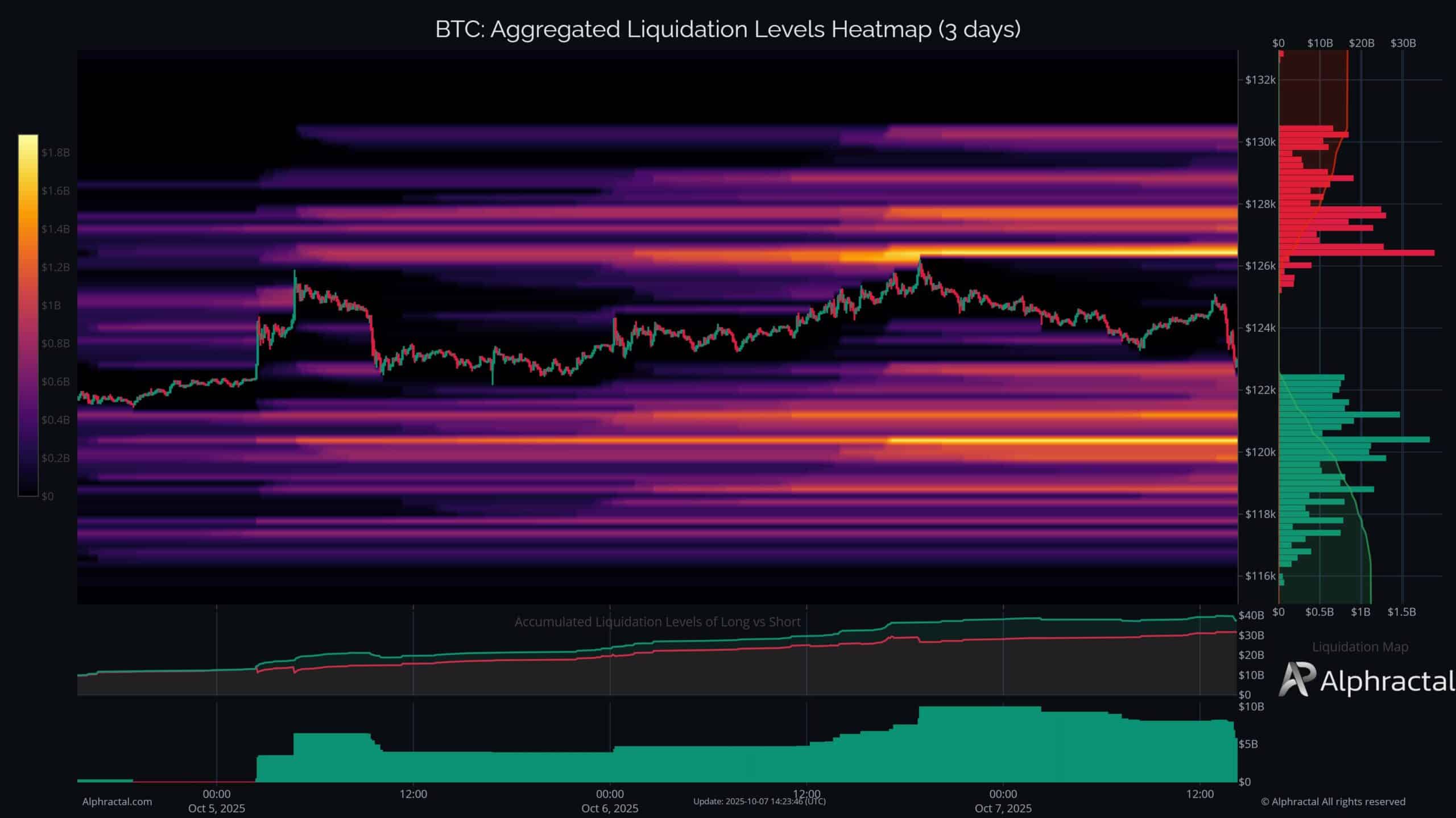 Data from Alphractal’s heatmap shows dense liquidation clusters forming between $122K and $126K, with another major zone near $117K; a level analysts are watching closely.