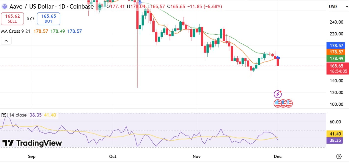 Since getting rejected at $190 four days ago, AAVE has faced intense downward pressure. The token has declined for four consecutive days, hitting a local low of $165.