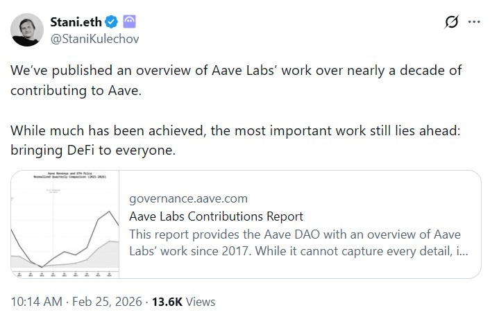 Aave Chan Initiative (ACI) founder Marc Zeller on Wednesday published what he called a transparency report reviewing Aave Labs’ historical funding and applied a return-on-investment framework to past DAO grants. Hours earlier, Aave Labs released its own contributions report outlining its role in building the protocol since 2017.