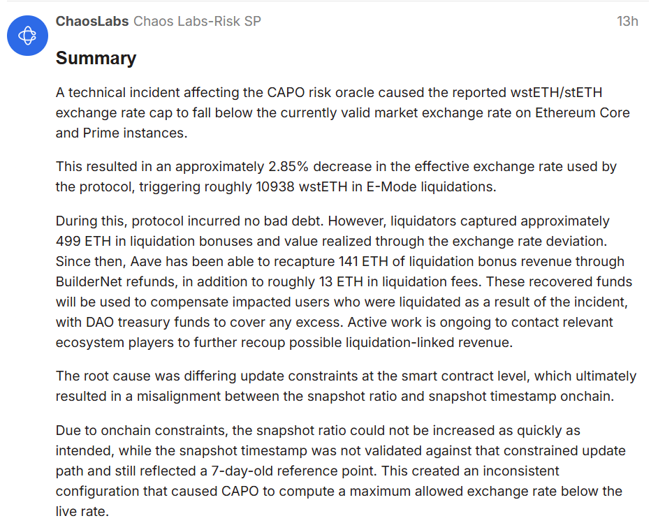 Aave said it recaptured 141 ETH ($285,000) in liquidation bonus revenue through BuilderNet refunds and another 13 ETH in liquidation fees, which will be used to compensate impacted users who were liquidated due to the incident. DAO treasury funds will be used to cover any shortfall.