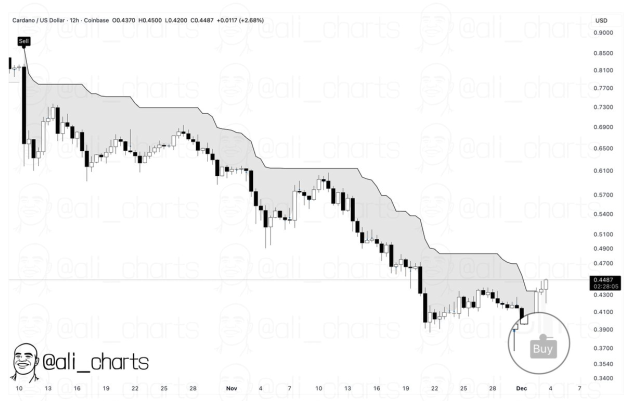 Ali Martinez shared a new Cardano chart, highlighting that the SuperTrend indicator has just flashed a fresh buy signal. The indicator typically flips bullish when candles break above its dynamic resistance band. On ADA’s chart, this signal appears after weeks of decline, creating a short-term window for a relief bounce. However, broader market pressure still weighs heavily on ADA’s upside potential.