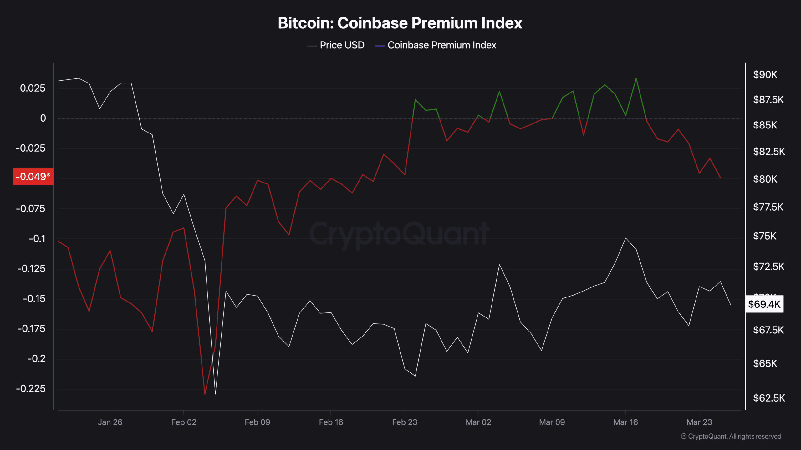 At the time of writing, the premium sat in negative territory at -0.04, indicating weaker buying pressure from U.S investors. Historically, readings in the red zone have correlated with price declines, with this reading no exception.