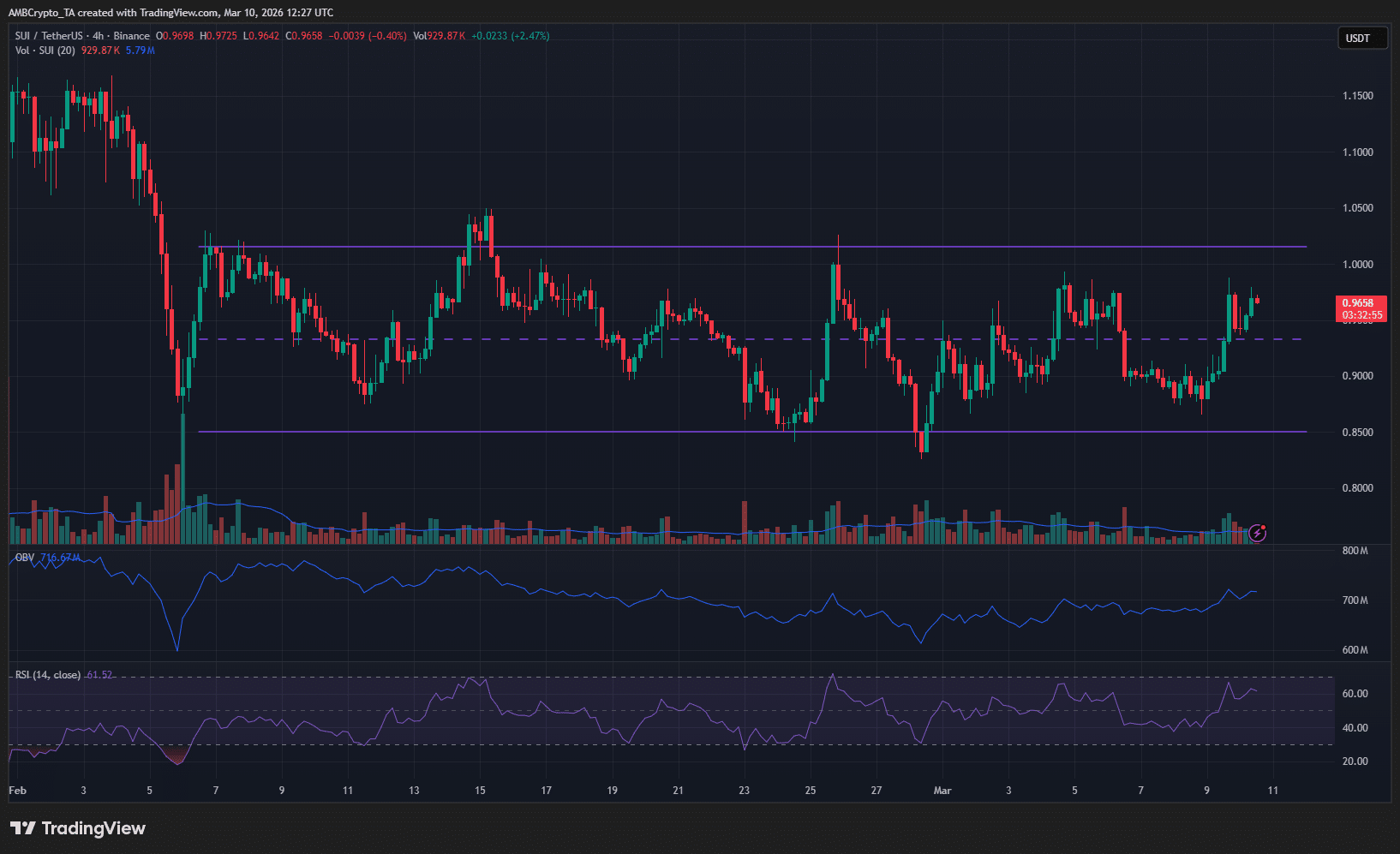 There have been no notable trends recently. Over the past month, SUI has traded within a rough range whose extremes were at $0.85 and $1.01. The local supply zone at $0.97-$1.0 was tested last week. It was also being challenged at press time.