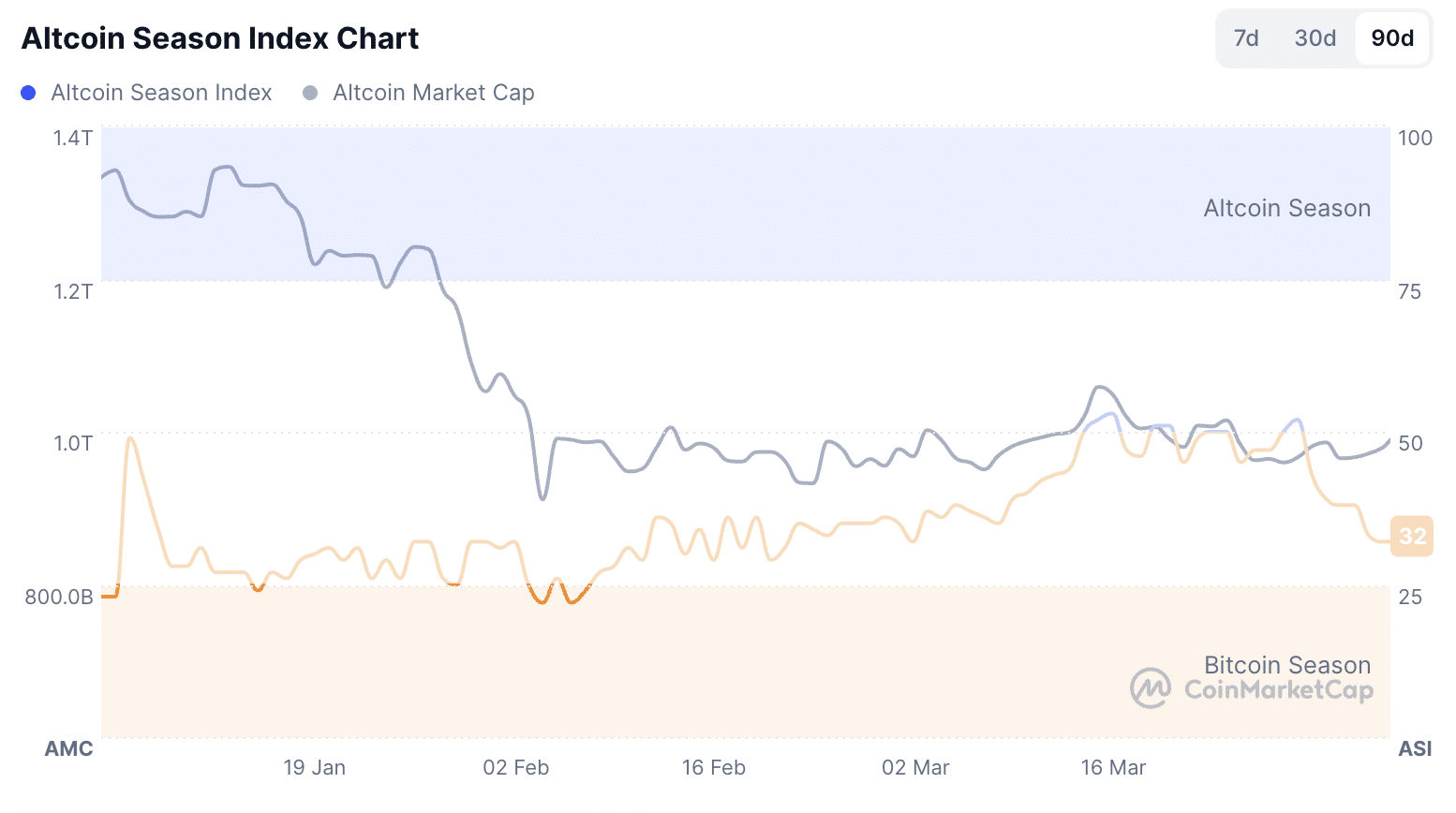 The CoinMarketCap Altcoin Index, sitting at 32 at the time of reporting, further suggests that the Bitcoin season is still in action.