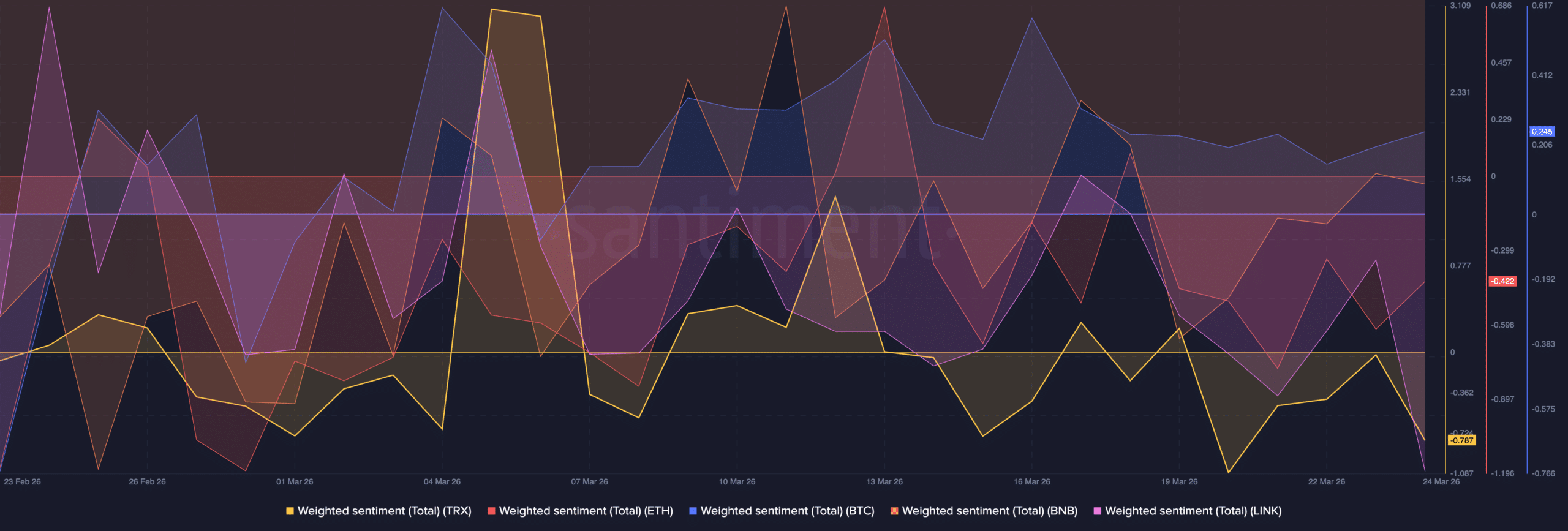 This was further confirmed by Santiment’s Weighted Sentiment analysis. The chart clearly shows that Bitcoin is the only token with positive Weighted Sentiment, whereas other altcoins are below the 50-level mark in the negative zone.