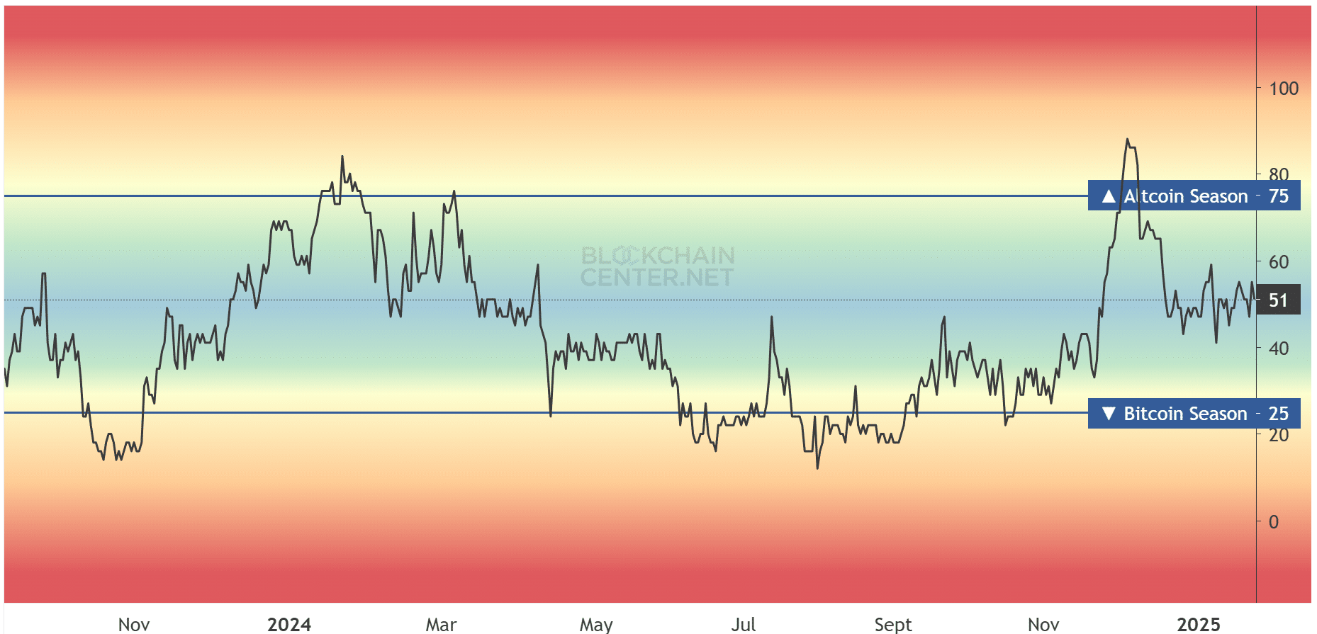 - Altcoin season index has remained neutral since December 2024.