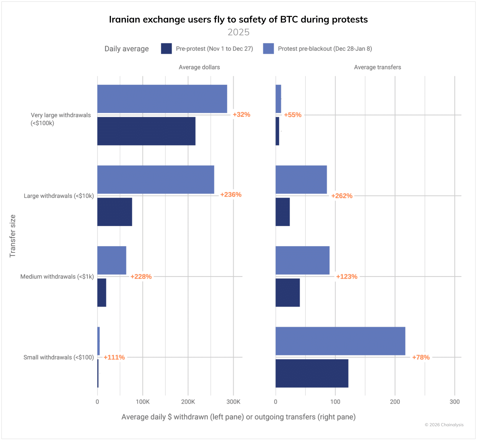 “Most telling is the surge in withdrawals from Iranian exchanges to unattributed personal BTC wallets. This surge suggests Iranians are taking possession of Bitcoin at a markedly higher rate during protests than they were beforehand.”