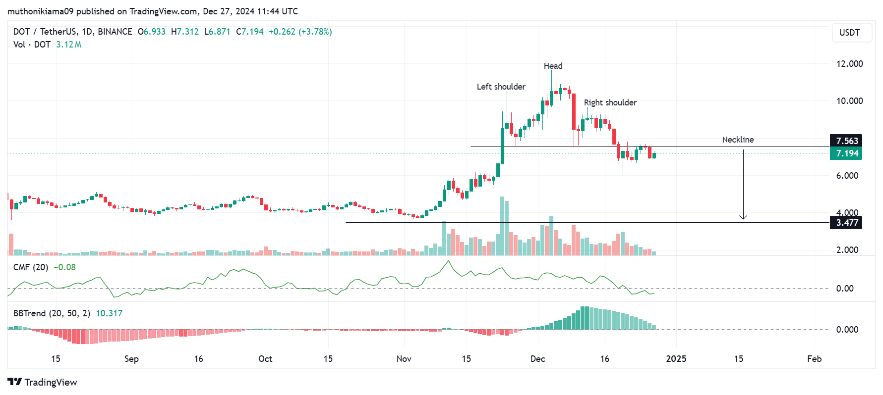- Polkadot formed a bearish head and shoulders pattern on its one-day chart, which could precede a drop to $3.47