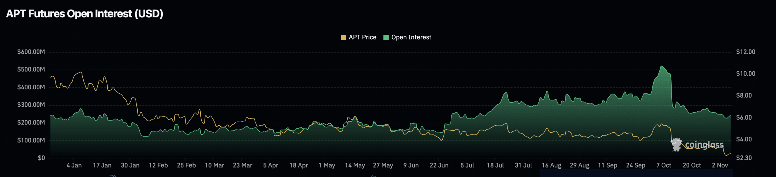Derivative investors continue to dominate activity in the APT market. According to CoinGlass, Open Interest has climbed to $275 million, reflecting a significant amount of liquidity in derivatives.