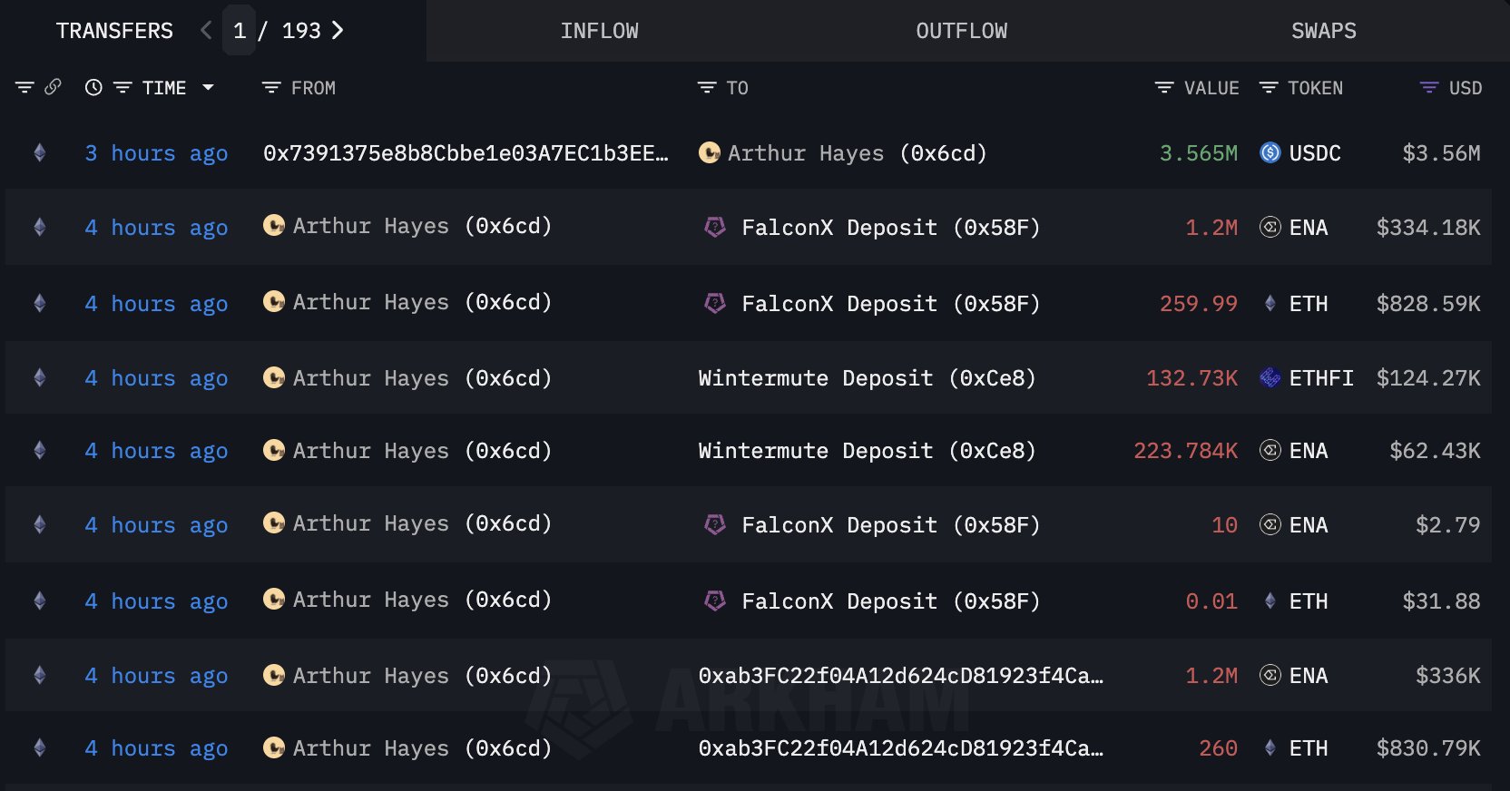 Data from Lookonchain showed Arthur Hayes moving quickly to cut risk after the market’s downturn, routing multiple transactions through FalconX and Wintermute. His largest sale was roughly $2.48 million in Ethereum [ETH], followed by $1.38 million in Ethena [ENA] and about $480,000 in Lido DAO [LDO].