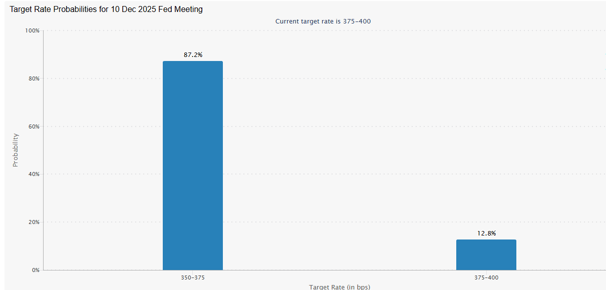 Finally, according to the CME FedWatch tool, the probability of a 25 bps cut has now surged to 87.2%. Also, only 12.8% of traders expect the Fed to leave rates unchanged.