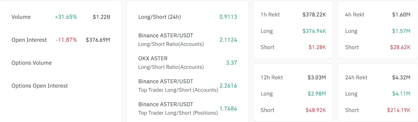 - Aster continues to face strong bearish momentum as whales exit and traders unwind positions.