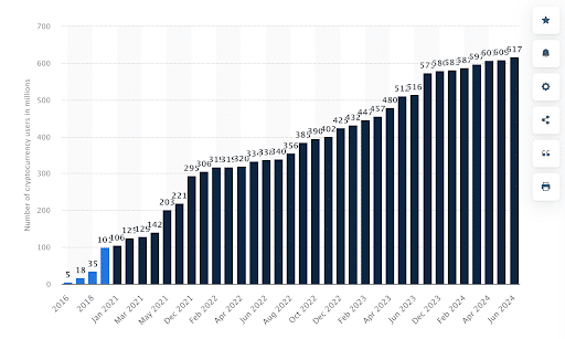 In the last bull market, the crypto user base more than tripled between December 2020 and December 2021. Per data from Statista, there are 617 million crypto users today.