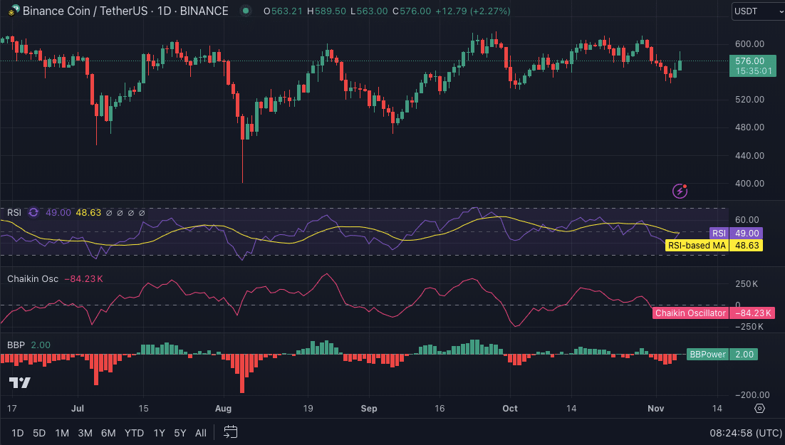 With an observed 3.49% price increase to $582.86 over the past day, BNB displayed a consistent upward momentum. The Relative Strength Index (RSI) rested at 51.61, signaling a neutral sentiment in the market.