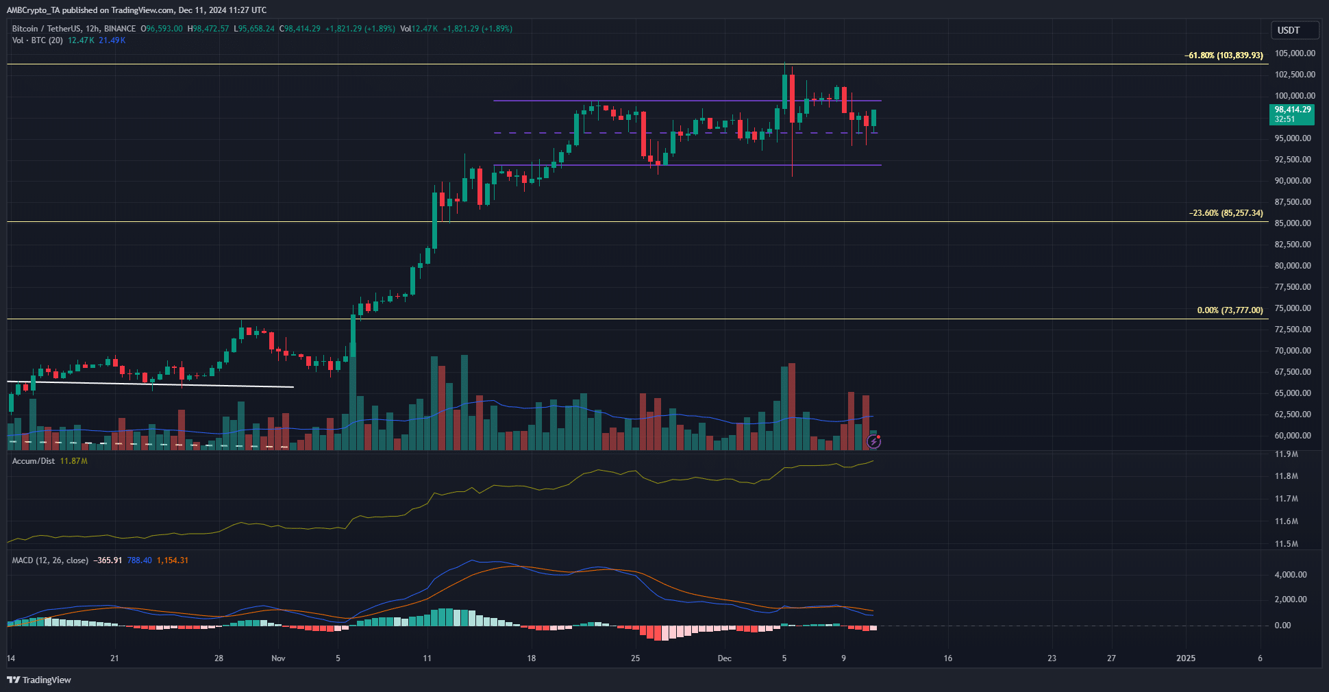 Bitcoin defended the mid-range support at $95.8k over the past three days. It has not closed a 12-hour session below the mid-range level. Moreover, the A/D indicator has been trending higher this week.