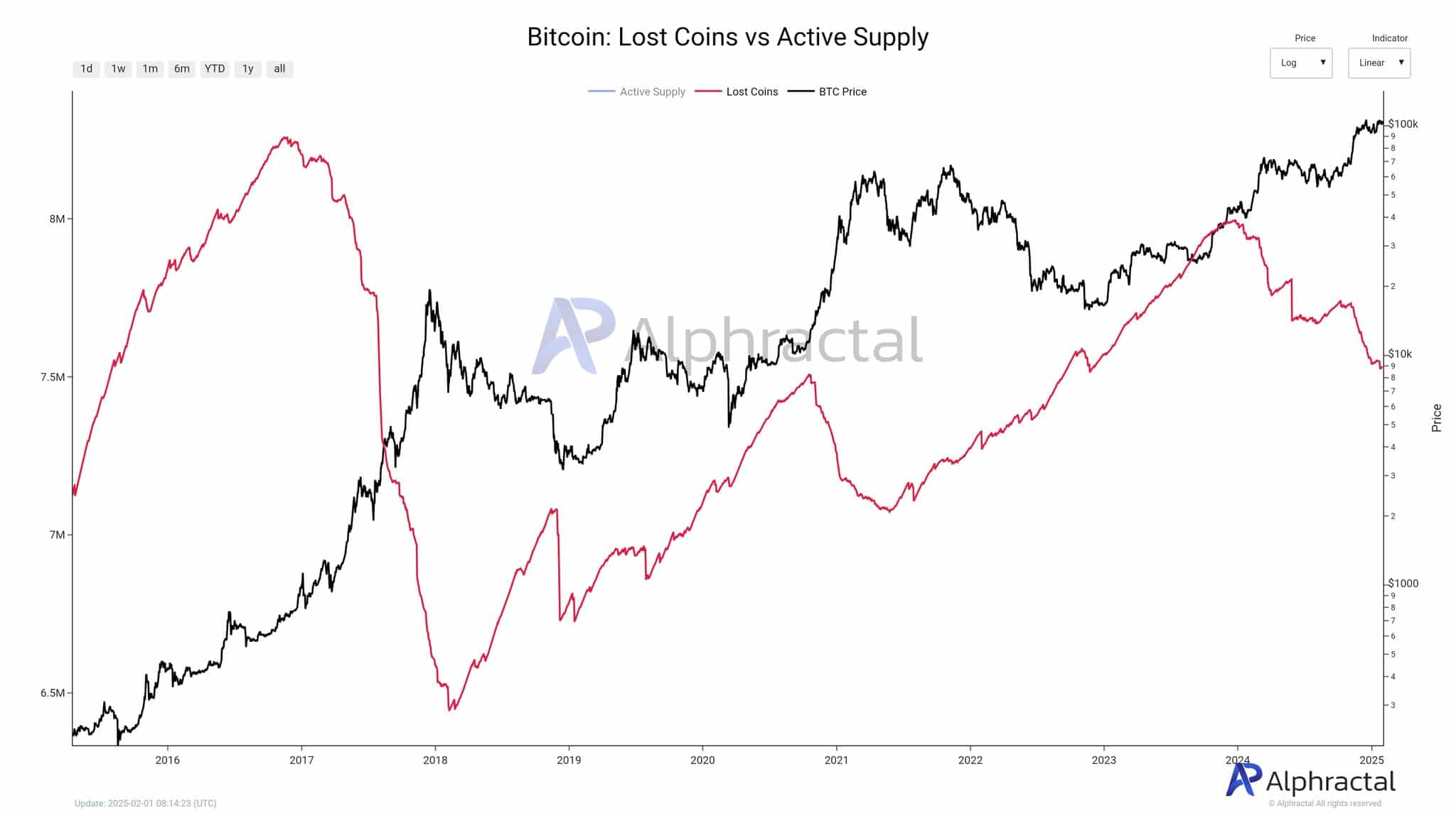 Lost coins refer to BTC that has been dormant for years, often held by early investors or whales who either forgot or chose not to move their assets.