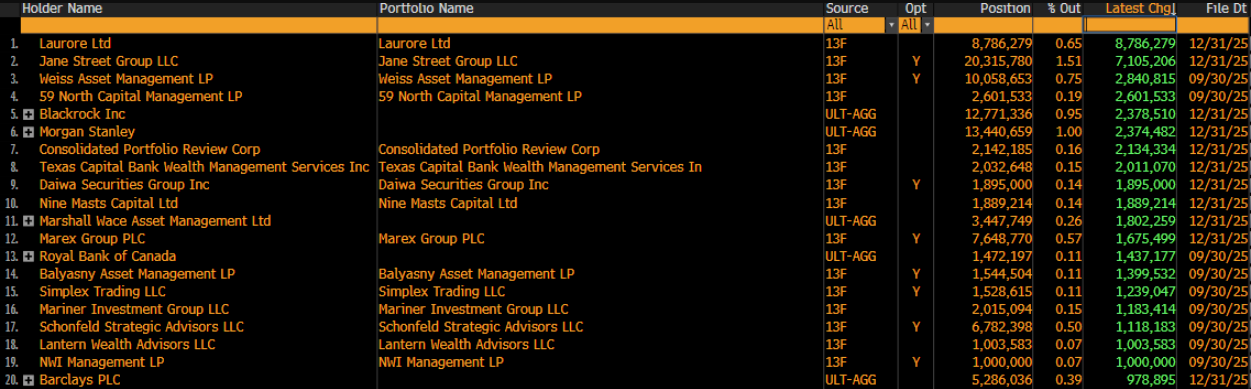 Beyond Laurore and Jane Street, several institutions made significant moves with IBIT in Q4 2025. Weiss Asset Management reportedly added about 2.8 million shares ($107.5 million), while 59 North Capital increased its position by 2.6 million shares ($99.8 million).