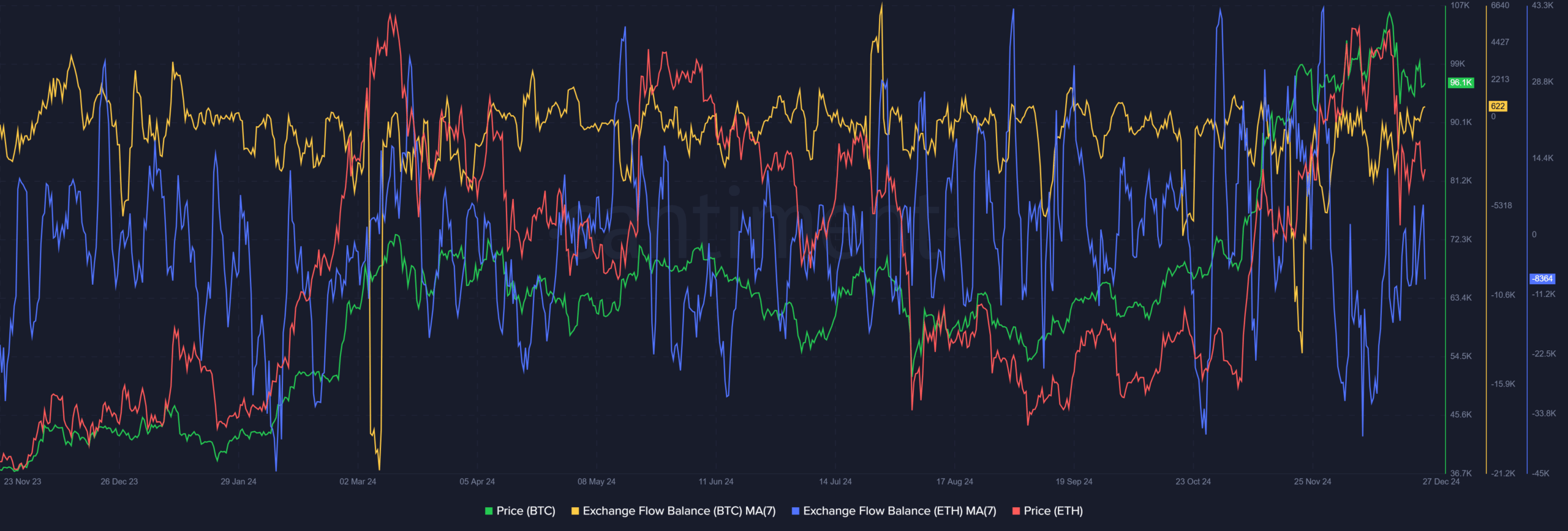 AMBCrypto examined the flow of BTC and ETH to and from exchanges around Christmas time. A 7-day moving average was used to smooth out the readings. In 2023, BTC saw the 7-day MA reach 1,481 BTC inflow on 22 December, and the 7-day ETH inflow was 32,805. A few days later, they went the opposite way.