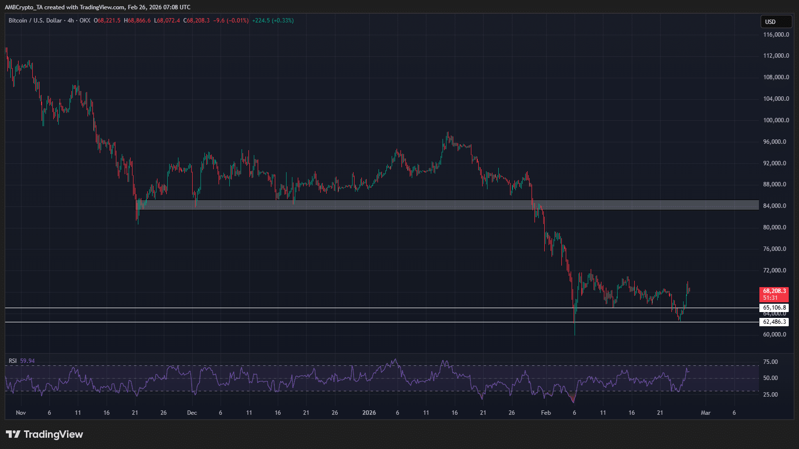 Earlier weakness had driven Bitcoin [BTC] into the $64,000–$65,000 demand zone, where bids gradually stabilized volatility.