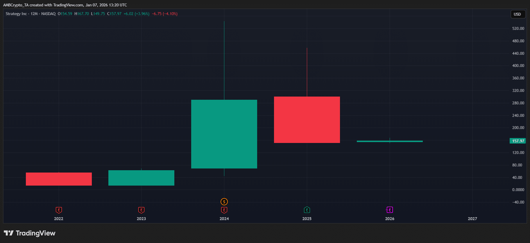 Strategy [MSTR] shows this clearly. The stock finished 2025 down 45%, its worst year since the 2022 bear market. The knock-on effect? Bitcoin’s [BTC] October crash, which triggered $20 billion in liquidations.
