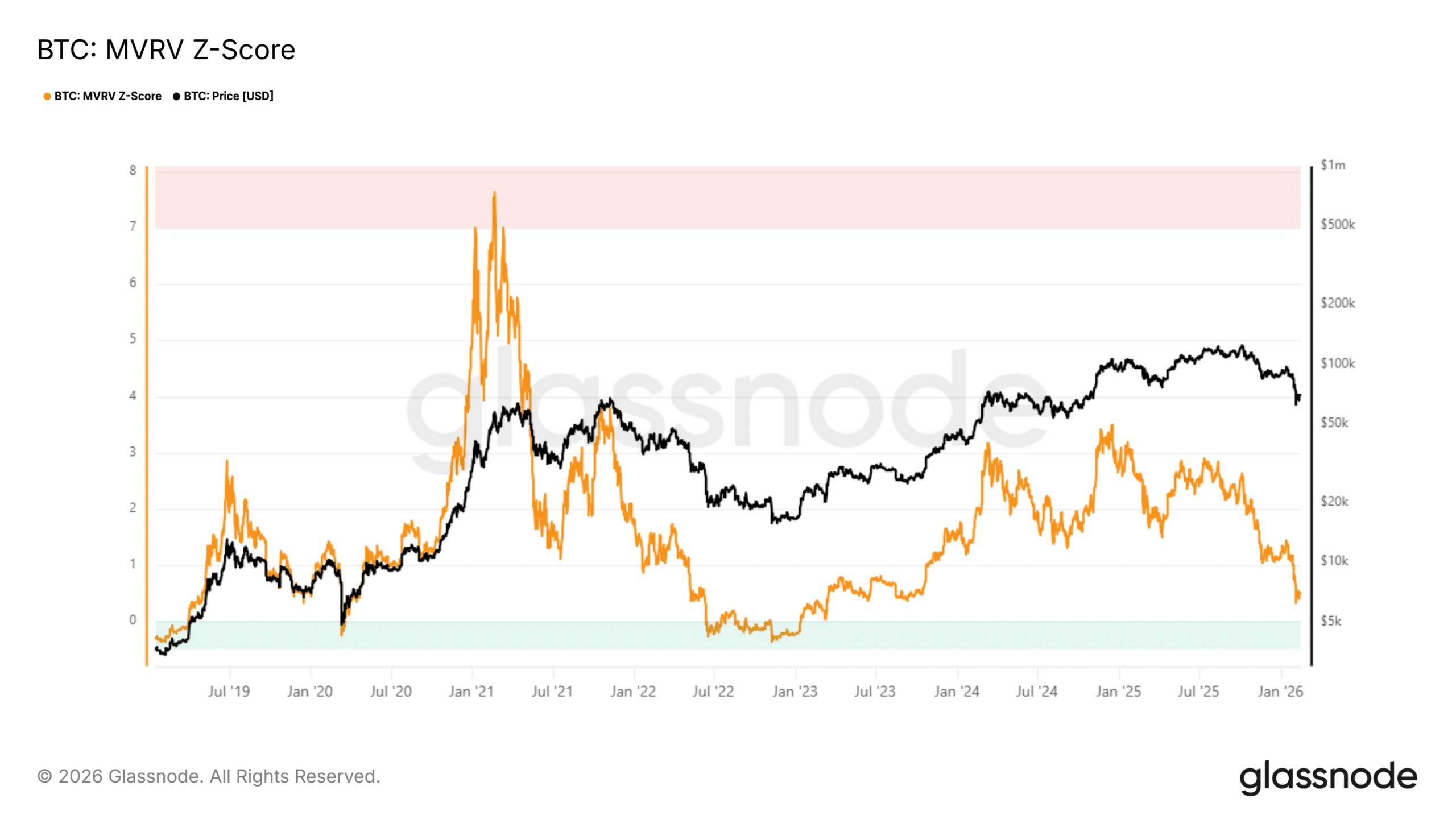 In contrast, the sub-seven-year supply cohort holds a higher realized cost, leaving recent entrants underwater and sustaining distribution. Thereafter, the MVRV Z-Score compresses toward 0.5, revisiting prior value zones.