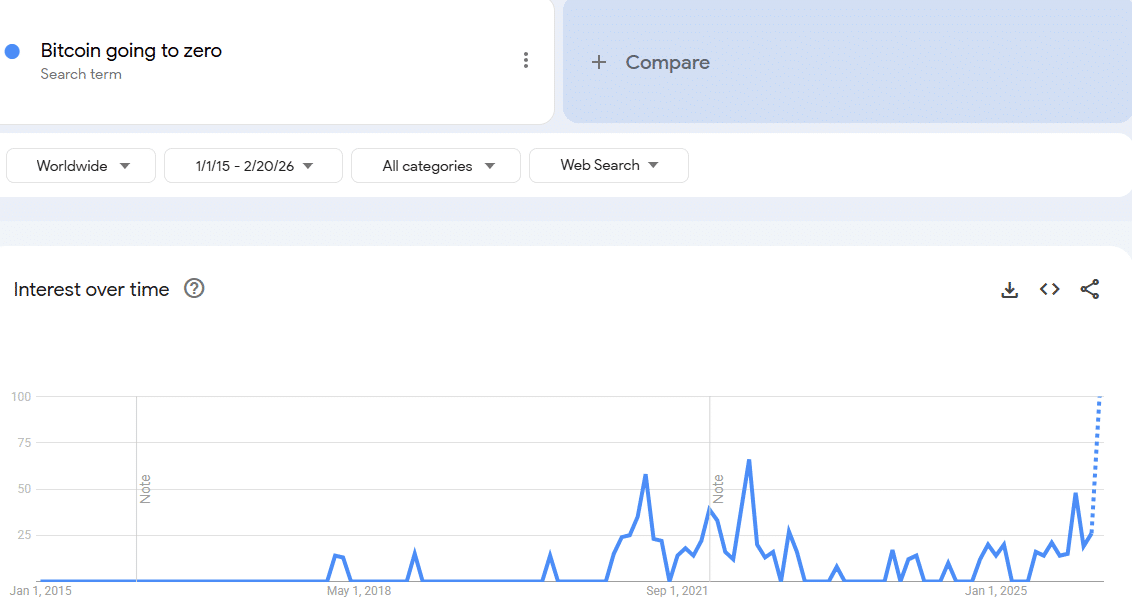 Google has flashed another crucial buying signal for Bitcoin. According to Google Trends, the search term “Bitcoin going to zero” hit a record high in February 2026.