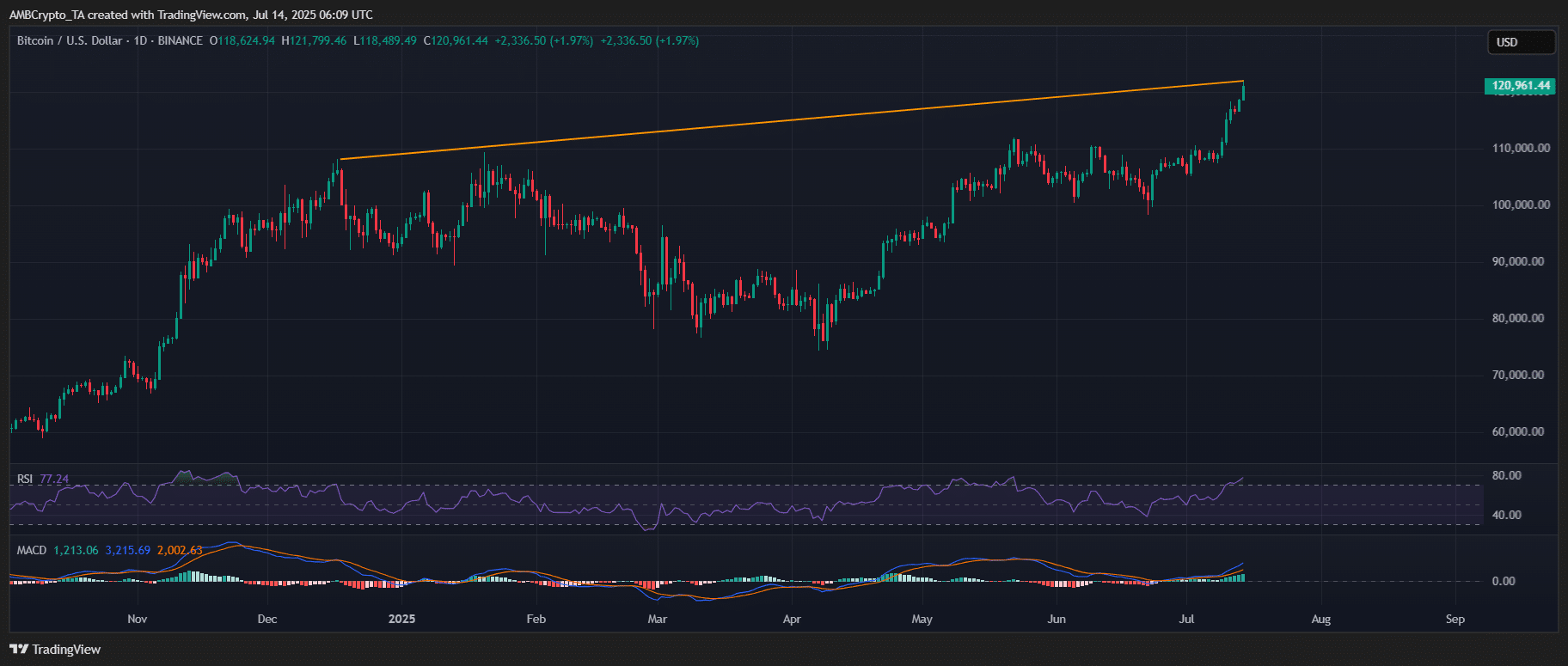 Bitcoin [BTC] just ripped to a fresh all-time high, breaking into the $122k zone with a strong 2.42% intra-day move. In fact, it’s now officially Bitcoin’s most aggressive rally of the cycle so far.