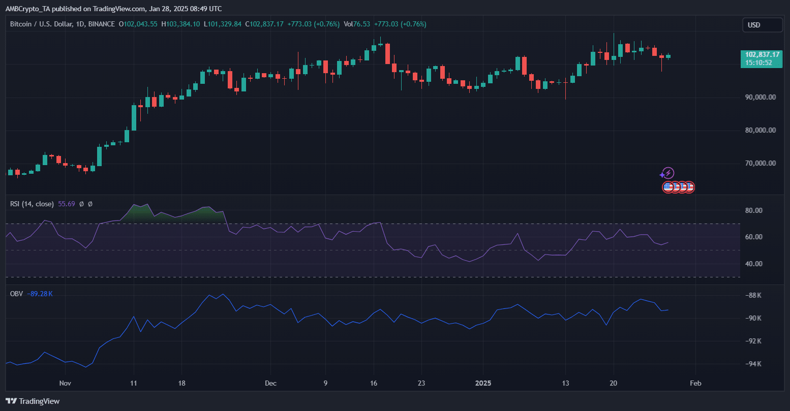 Bitcoin has shown resilience, with its price climbing to $102,837. There has been a gradual uptrend since November, marked by consistently higher lows. The RSI is currently at 55.69, indicating neutral momentum with room for growth.