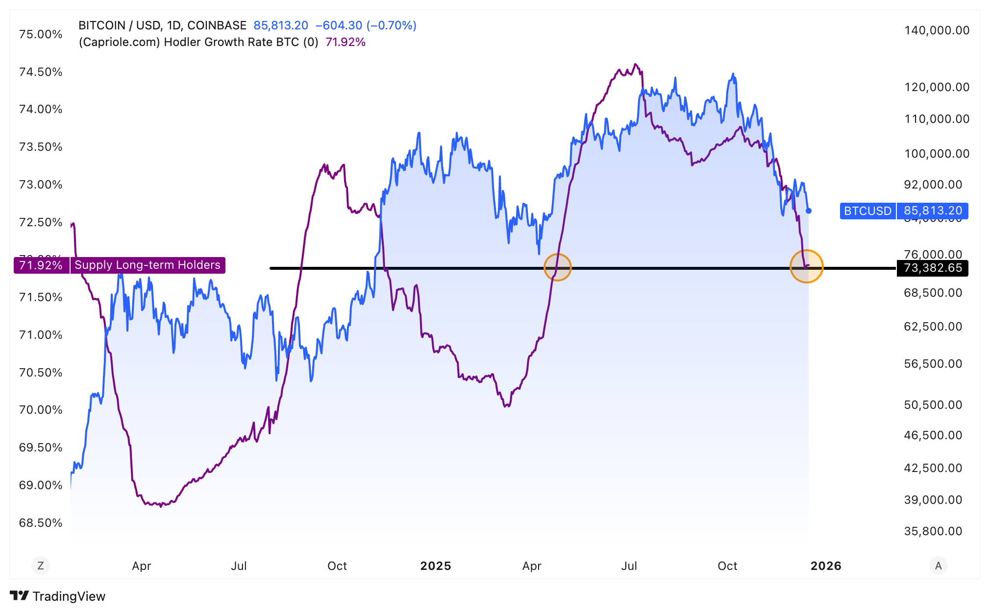 Bitcoin long-term holder supply, %. Source: Capriole Investments