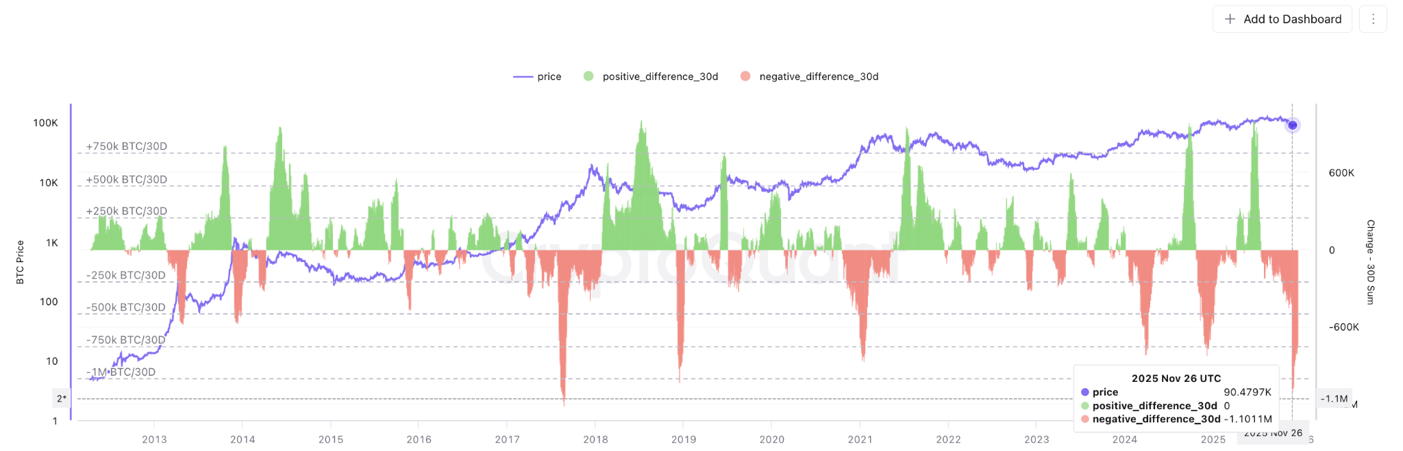 Bitcoin 30-day rolling LTH supply change. Source: CryptoQuant