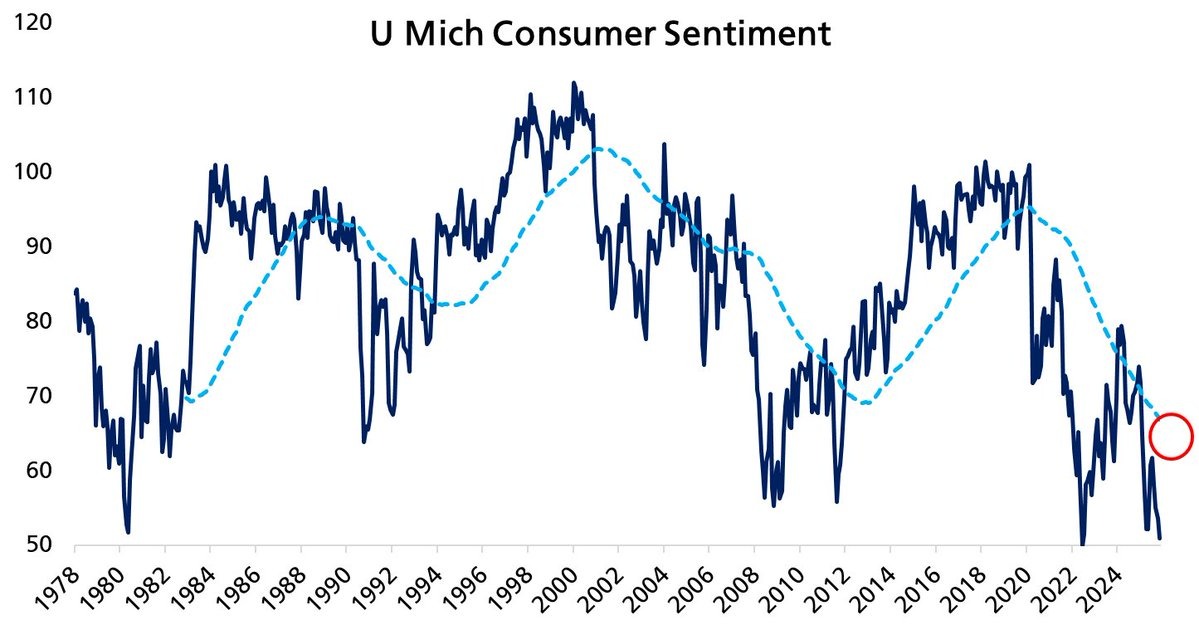 Economist Timothy Peterson pointed out that consumer sentiment is approaching record lows, with the “5-year average at an all-time low.”