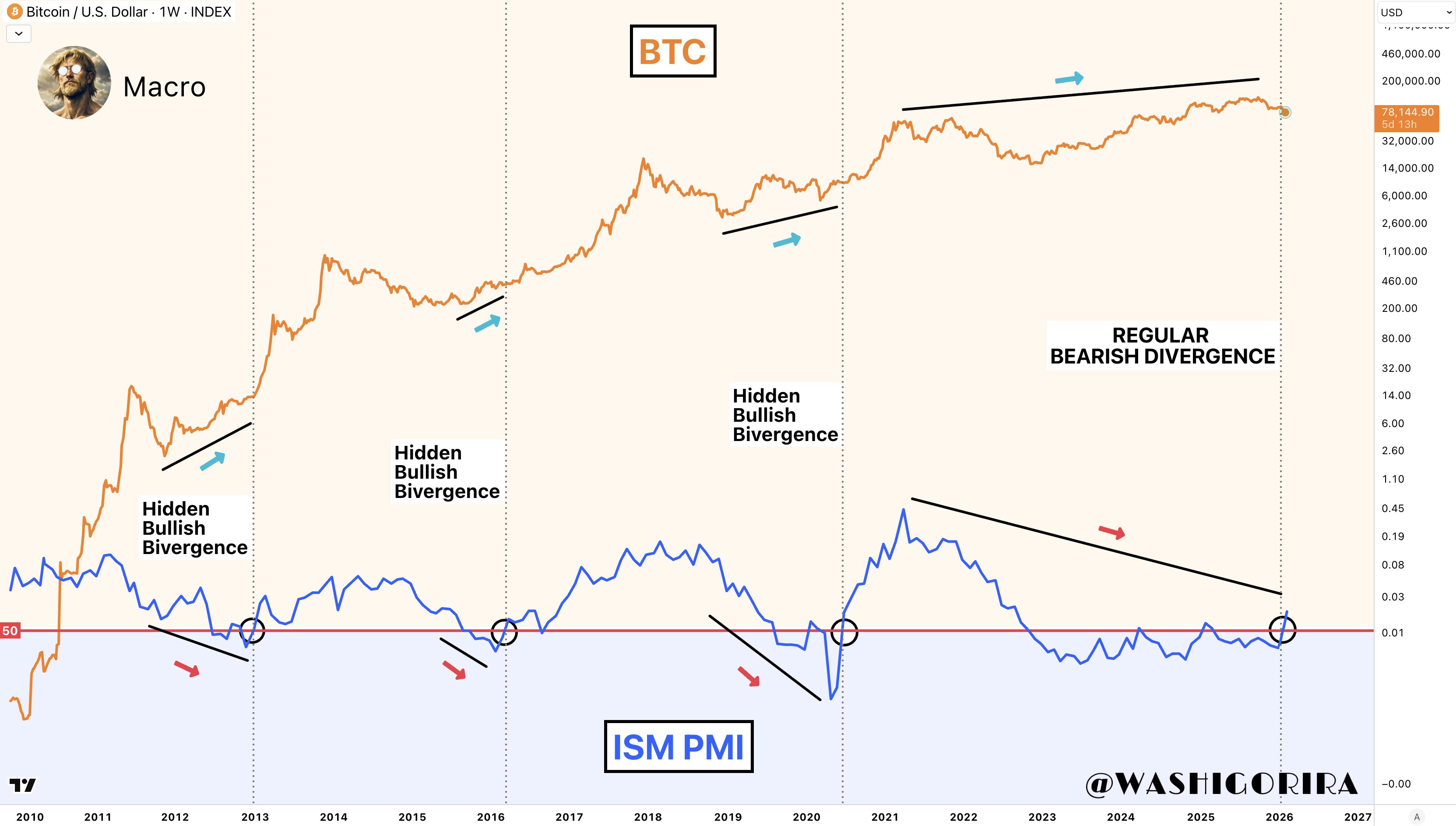 “In 2013, 2016 and 2020, when PMI moved back above 50, Bitcoin showed a hidden bullish divergence. Each time, a bull run followed. Today? PMI just crossed above 50 again but this time we have a regular bearish divergence instead,” he concluded.