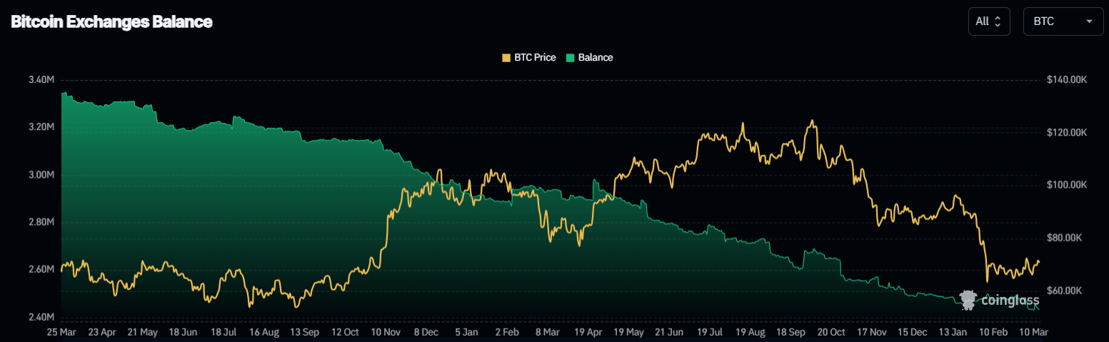 Bitcoin [BTC] Supply on Exchanges has continued to fall lately, reinforcing a broader structural shift towards long-term holding.