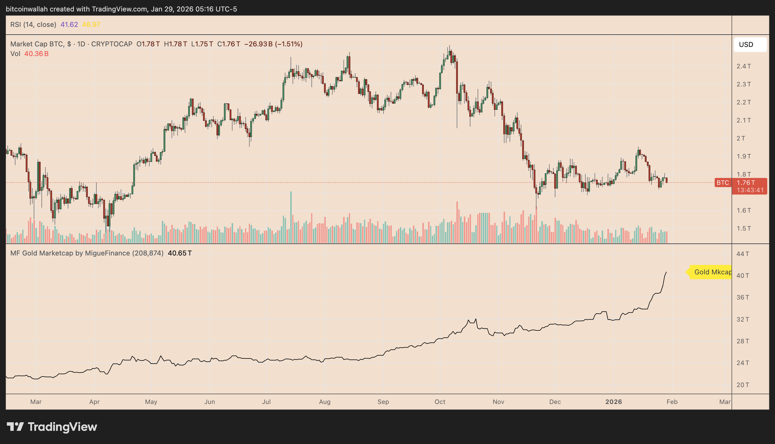As of January, Bitcoin’s worth was only about 4.30% of gold’s $41.69 trillion market cap.