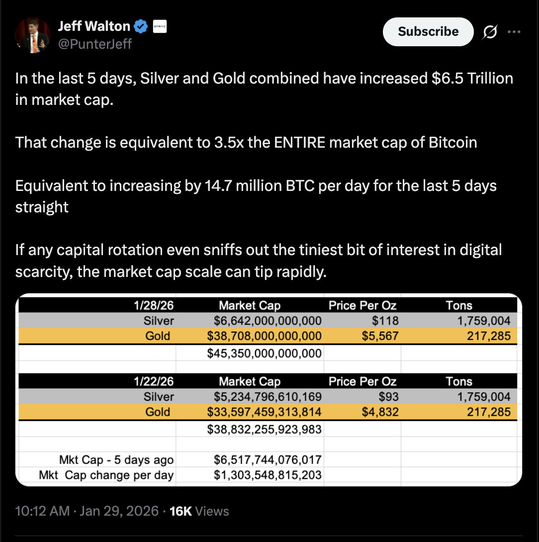 Bitcoin only needs a modest share of gold-style demand to rotate into BTC, according to Jeff Walton, chief risk officer at Strive, a BTC treasury company.