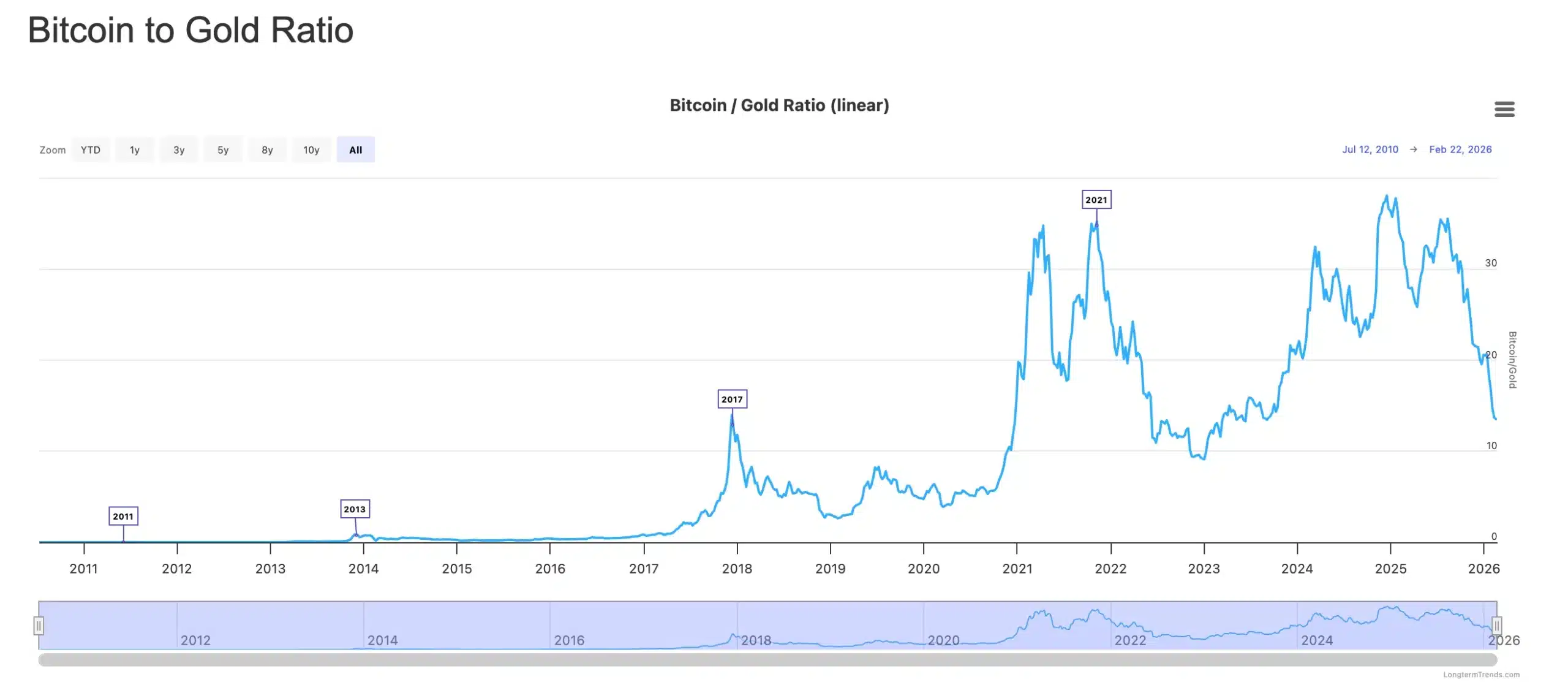 While real gold prices have been rising, Bitcoin has been falling. The Bitcoin-to-Gold ratio has dropped over a year.