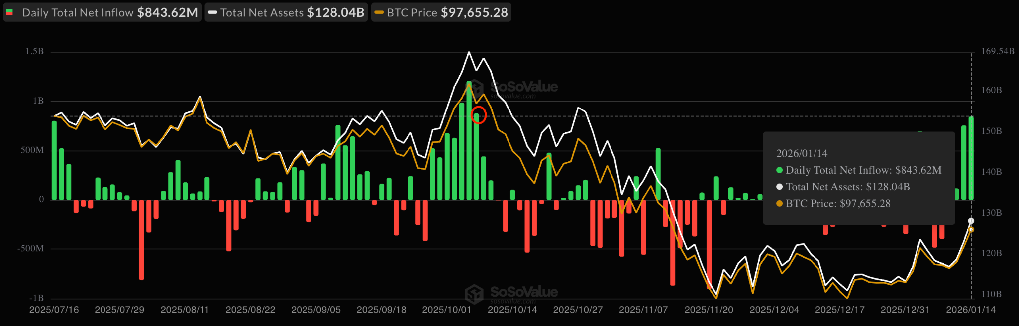 The $843.6 million recorded on Wednesday was the highest since Oct. 7, 2025, and marked the largest single-day inflows of 2026