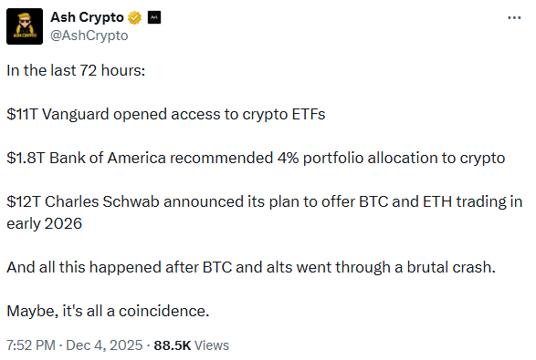 Over the past three days, institutional activity has picked up. For instance, Charles Schwab, which manages $10 trillion in assets, plans to let clients trade spot BTC and Ethereum [ETH] starting early 2026 with a pilot rollout.