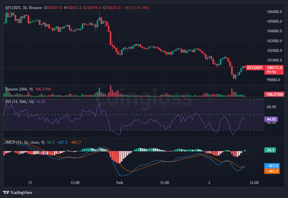 AMBCrypto’s look at BTC’s price showed a recent downtrend followed by a small recovery. The price has dropped significantly, but was attempting a bounce from the $99,000 level, trading at $100,273 at press time.
