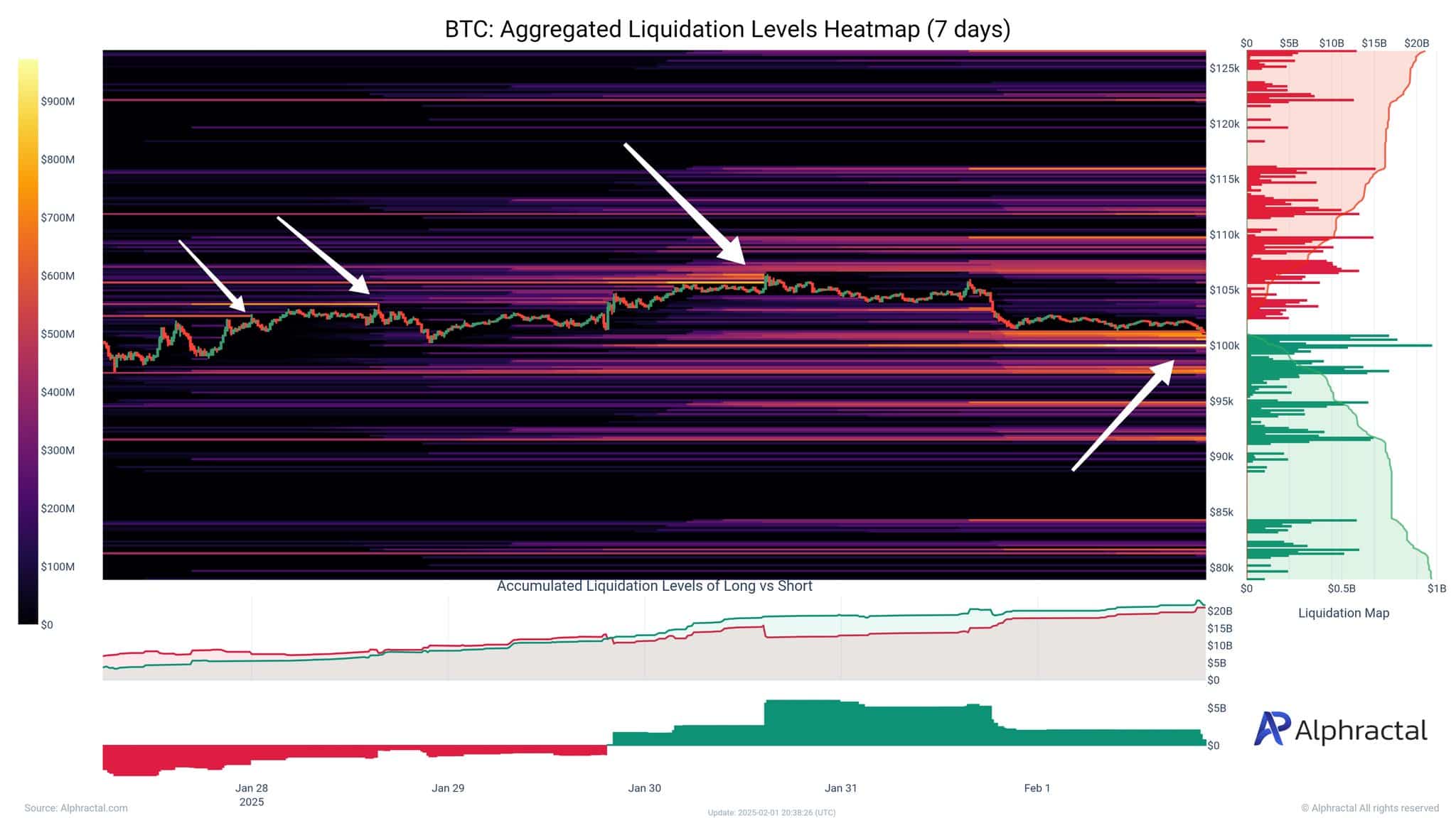 The market has witnessed intense liquidation activity, with the highest concentration occurring between $101,500 and $99,800.