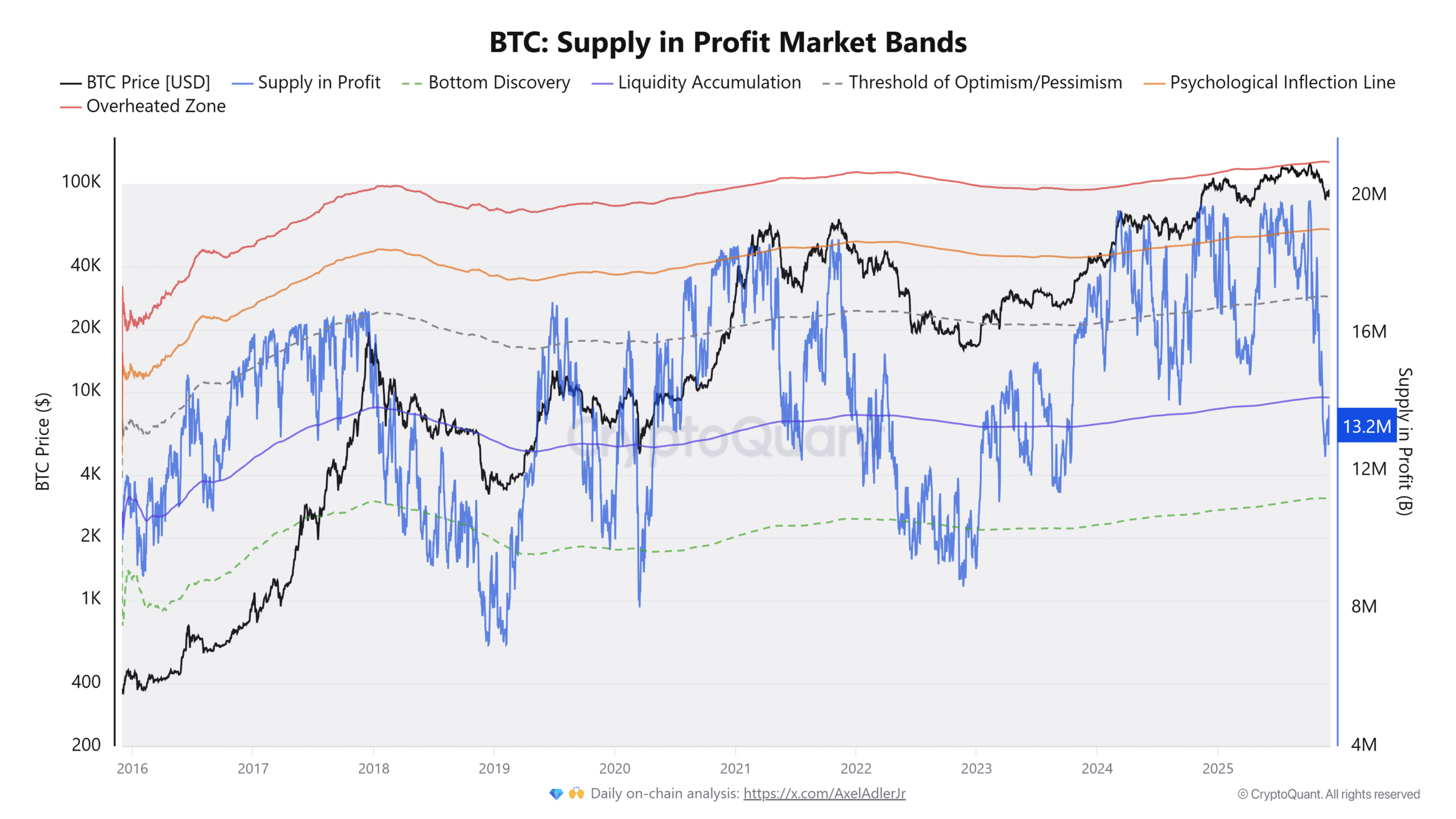 The Bitcoin Supply in Profit Market Bands metric has seen a swift plunge from being above the psychological inflection line, to falling below the liquidity accumulation.