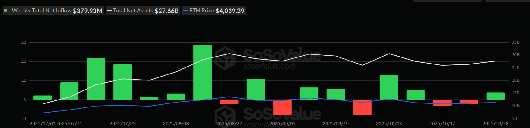 Ethereum ETFs had also been recovering, recording $379.9 million in net inflows this week and lifting total net assets to $27.66 billion, according to SoSoValue.