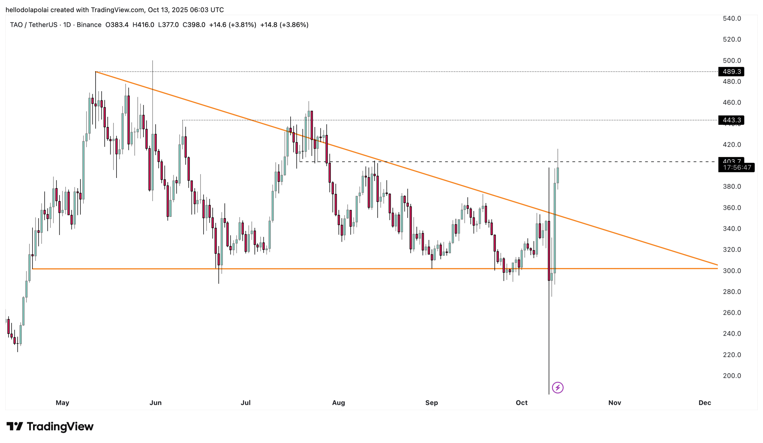 Chart analysis identified three short-term targets: $443, $489, and $500. However, for confirmation, TAO must close above its resistance level—a typical bullish indicator—near $403.