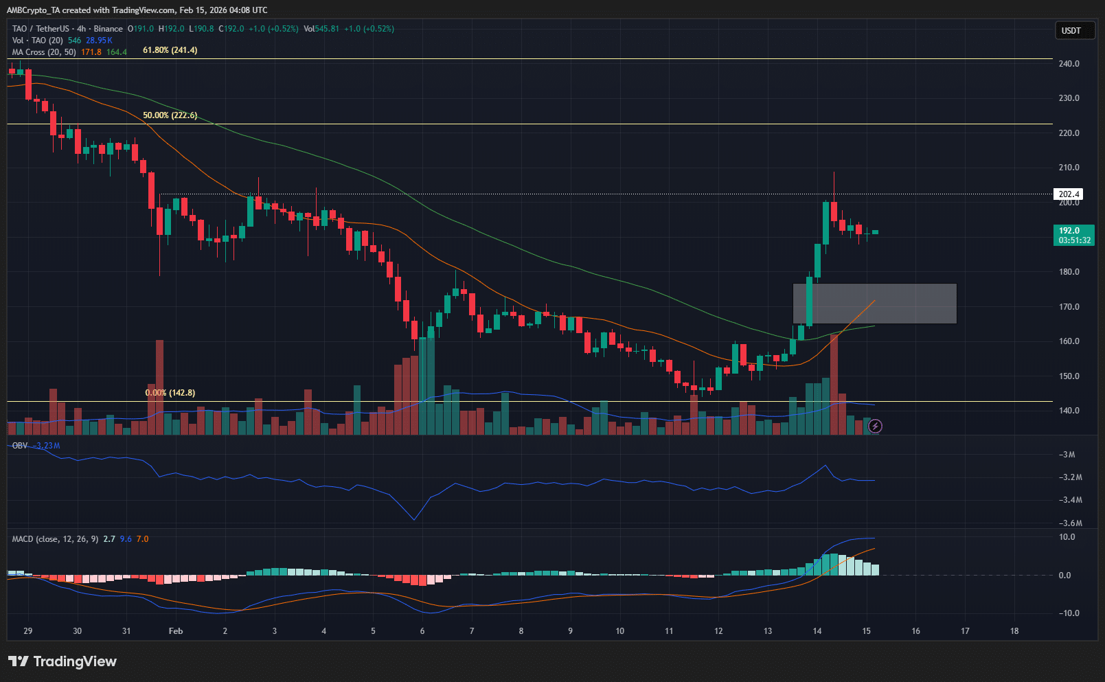 The current TAO bounce can extend beyond the local $200 supply zone. The Fibonacci retracement levels at $241.4 and $268.2 were the short-term bullish price targets.